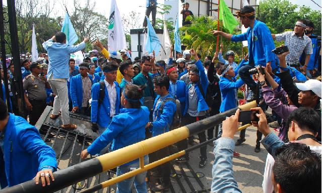 PEKANBARU - Ribuan mahasiswa yang tergabung dalam BEM Se-Riau menggelar aksi demo menuntut Presiden RI Jokowi dan Wapres JK di DPRD Riau. Mereka menuntut agar Jokowi tidak menggadaikan bangsa ini kepada asing.