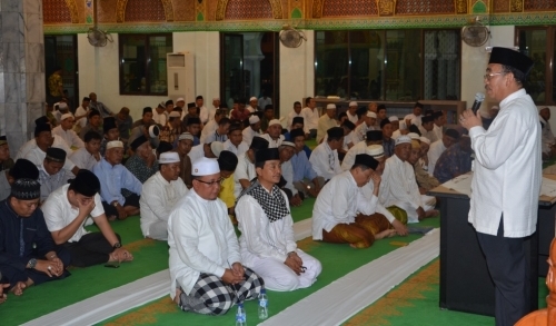 BENGKALIS - Bupati Bengkalis Herliyan Saleh memberikan sambutan sebelum salat Tarawih berjamaah di masjid Istiqomah Bengkalis, Rabu (17/6/2015) malam.