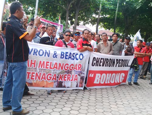 "Padahal pada bulan Desember lalu KSBSI bersama kontraktor Chevron dan disnaker kota Pekanbaru telah membuat kesepakatan untuk tetap memperkerjakan 82 anggota kami kembali. Namun saat ini kontraktor chevron tersebut merektrut tenaga kerja dari luar. Berarti Dinaker dan PT Beasko telah membohongi kami," tegasnya.