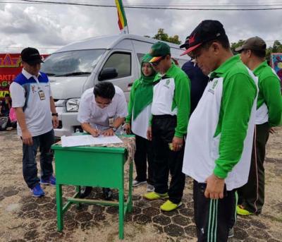 Bupati Kuansing, Drs. H. Mursini MSi, secara simbolis menyerahkan mobil Perpustakaan Keliling Bantuan Pemerintah Pusat, Rabu (3/1/2018) di sela Upacara Hari Amal Bakti Kemenag Tingkat Propinsi Riau di lapangan Limuno Teluk Kuantan.