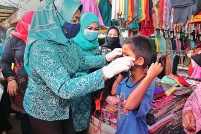 Apical Group di Dumai membagikan ribuan masker kepada masyarakat yang berada di pusat kegiatan perekonomian di Jalan Raya Lubuk Gaung Kecamatan Sungai Sembilan, Kota Dumai.