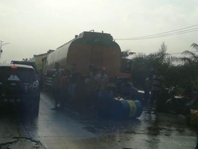 Mobil tangki pengakut Crude Palm Oil (CPO) terguling di Jalan Lintas Rokan Hilir arah ke Kota Dumai, tepatnya di Kilometer 20,5 Desa Mamugo, Kabupaten Rokan Hilir.